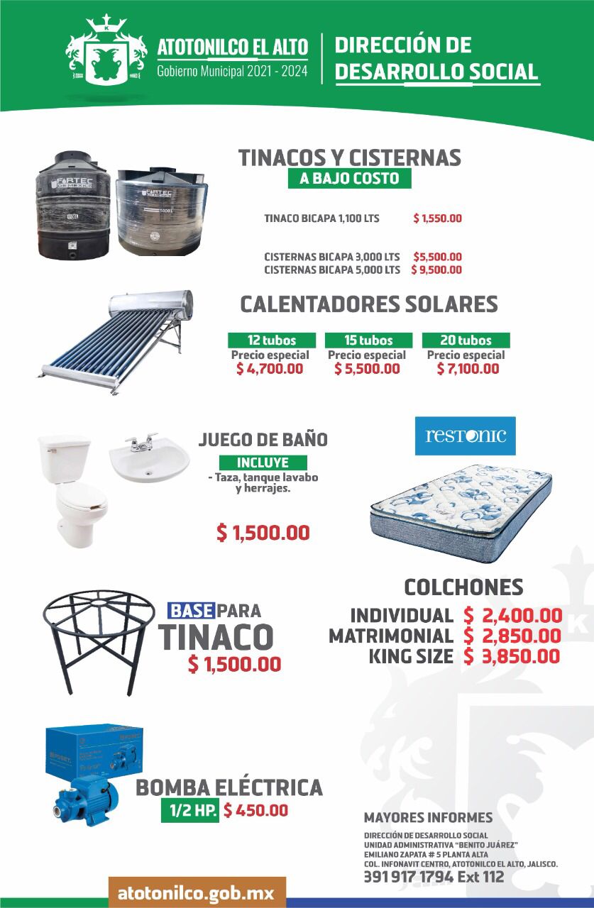 La Dirección de Desarrollo Social en busca de apoyar la economía de las y los atotonilquenses, pone distintos artículos para el beneficio de sus hogares a bajo costo.
