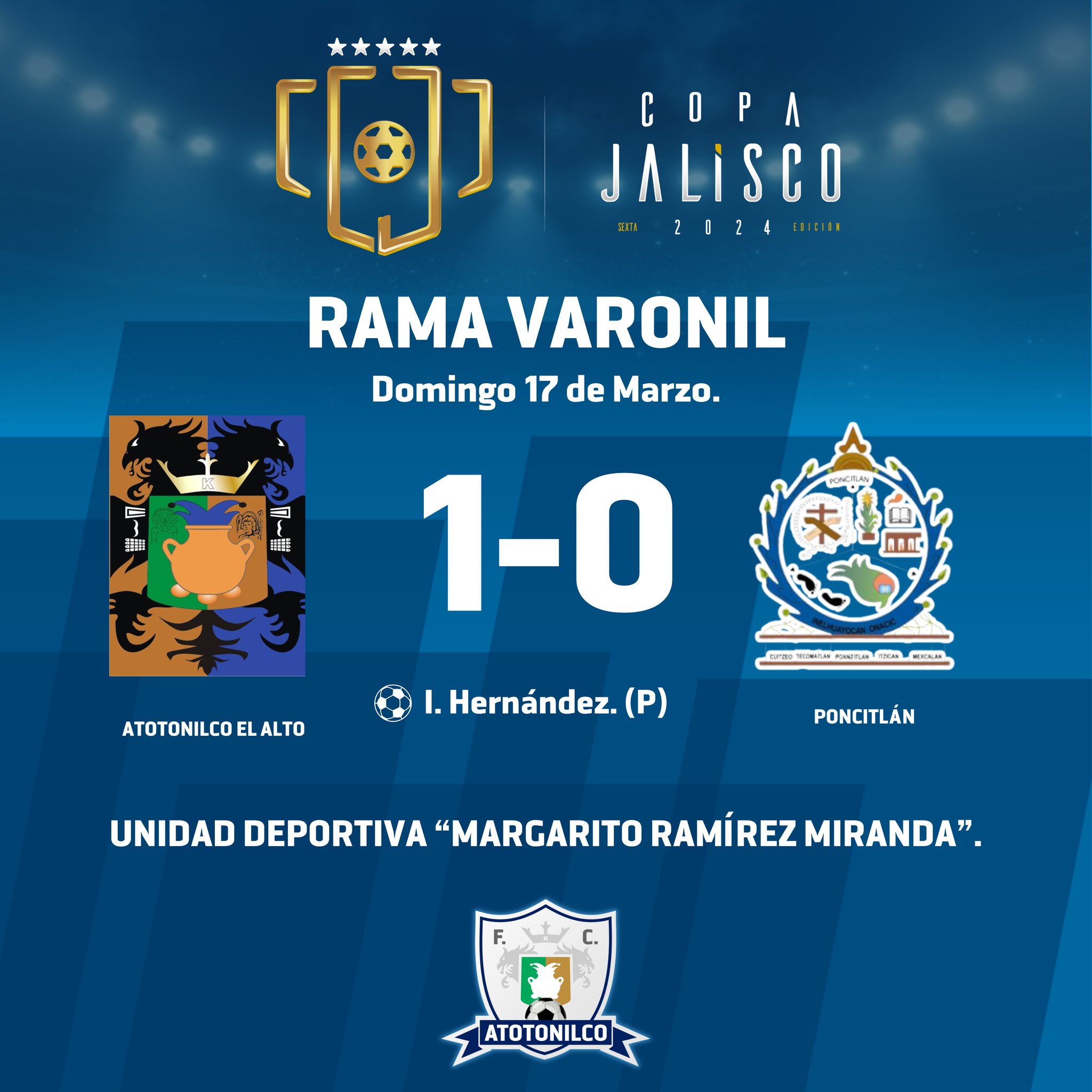 En un emocionante encuentro en la cancha de la Unidad Deportiva Margarito Ramírez Miranda, nuestro equipo demostró su talento y determinación al vencer al equipo de Poncitlán por 1 a 0, sumando valiosos puntos en la Copa Jalisco 2024.
